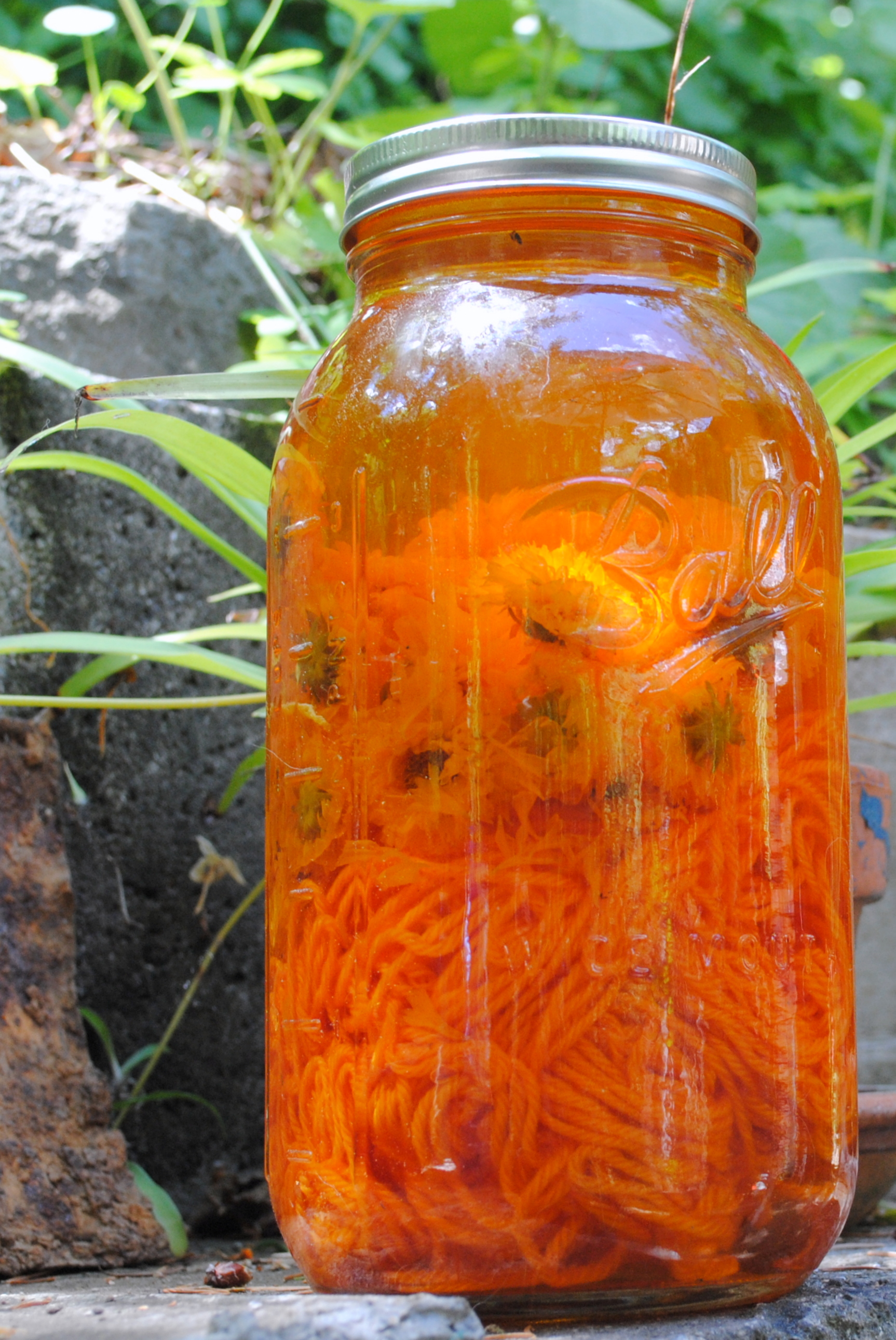 I added 1oz of dried and fresh coreopsis blossoms into a half gallon mason jar, poured tap water almost to the top, put the lid on, and set it in the sun. After an hour or so I noticed the solution turned yellow. I added one skein of 1 1/2 oz of super-alum mordanted wool.