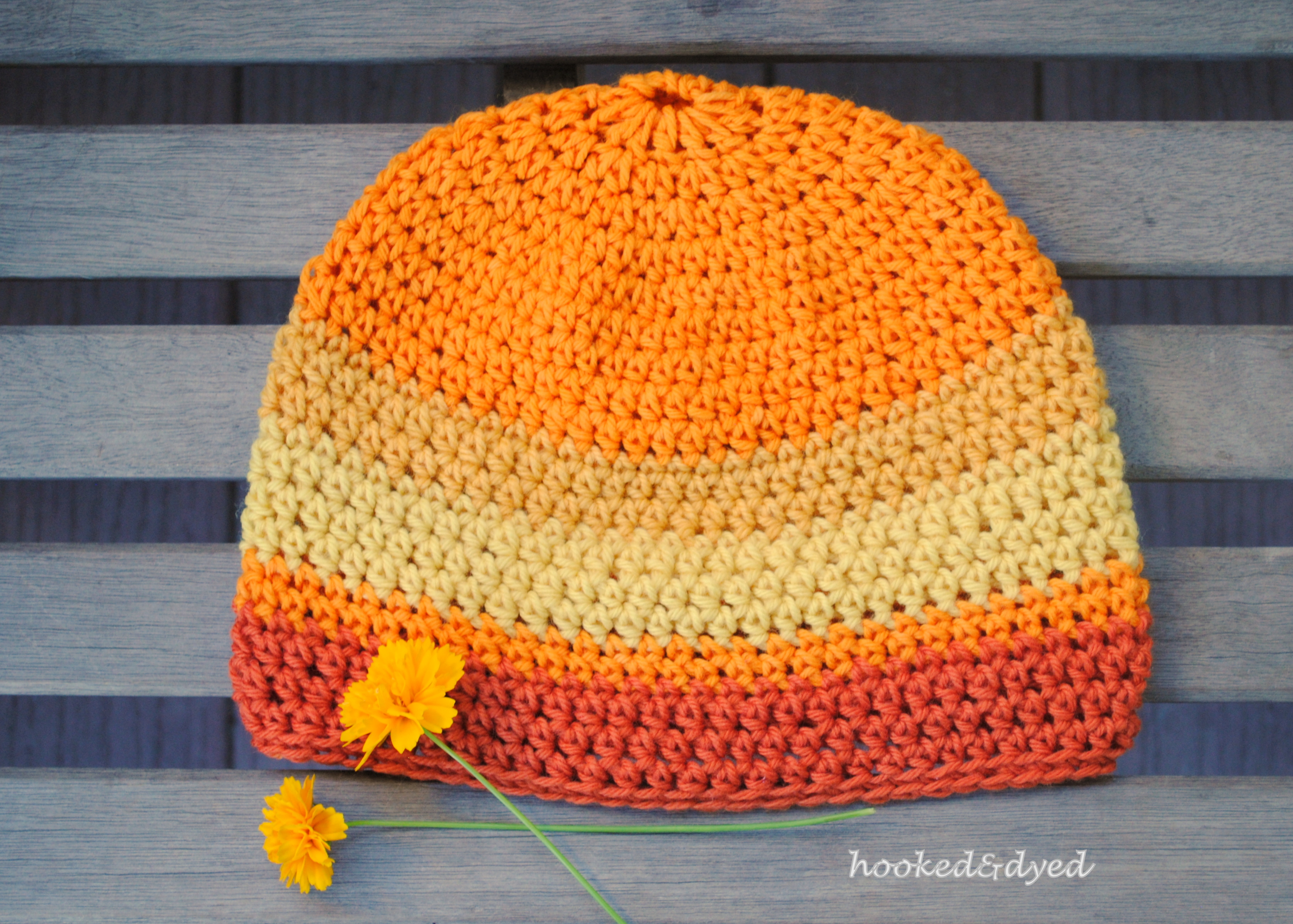 At the end of June, our weather in Northern California went haywire. It stormed on Monday like it would in January. While cooped up in the house with chicken soup simmering on the stove, I felt an urge to crochet the yarn I dyed with coreopsis into one outrageously, vibrant hat that announced SUMMER!