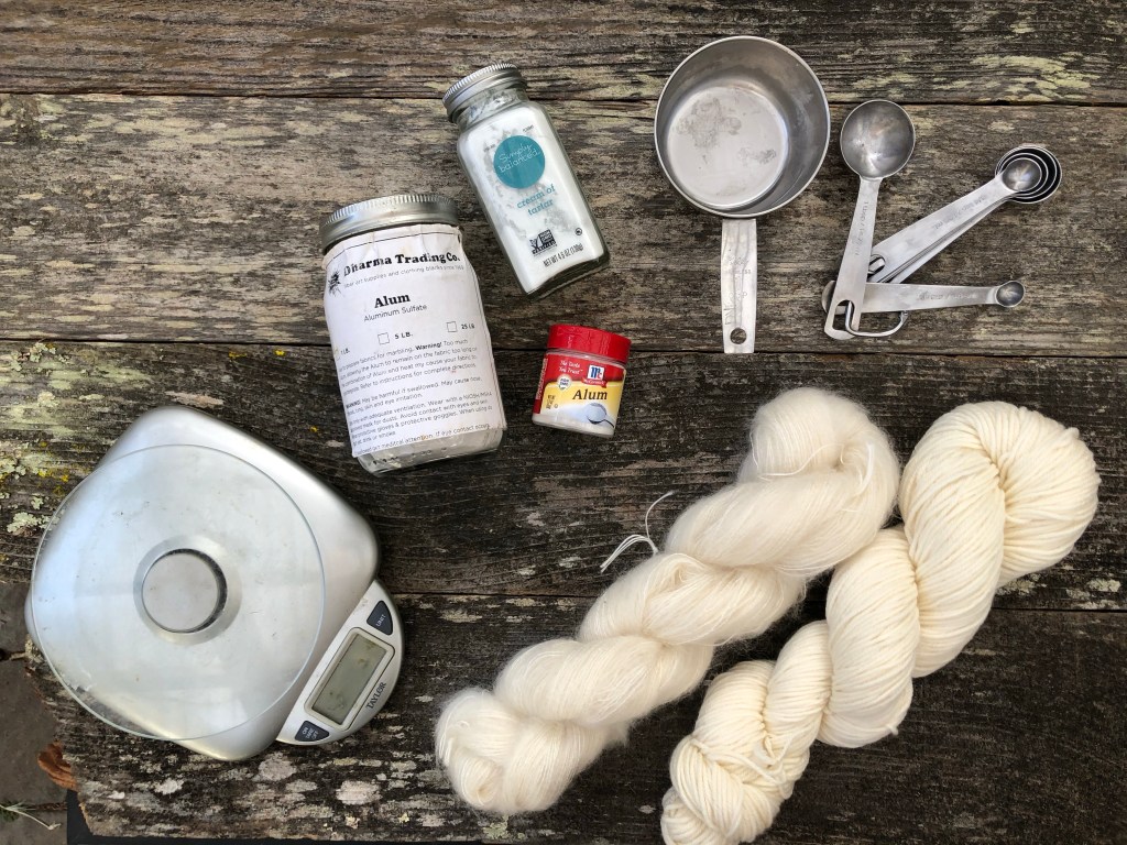 How much? This is based on the weight of dry fiber. Different sources will give you different ratios of alum to fiber, from 10-20%.  If you have 100 g of wool, you use 10-20 grams of alum. In other words, between 1-2 tablespoons. If you go towards 20% you’ll likely have alum leftover in the water and you can try reusing it. Any more than that, you risk your wool feeling sticky. I’ve always used a high ratio of alum and it’s a habit I haven’t been able to let go of, yet. This is another important point that I find helpful as a dyer: there is no one right way to do it. There’s a general framework to follow and lots of wiggle room for experimenting and deciding on what works best for you.